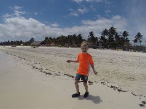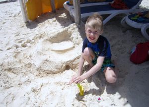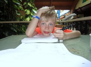 Vous allez remarquer que j’ai quand même fait des devoirs … en fait j’ai pratiqué mes mots de dictée avec ma mère et des maths avec mon père. Pour ma pratique de dictée maman m’a fait pratiquer au lobby de l’hôtel et mon endroit préféré était sur la plage. Je devais écrire mes mots dans le sable!